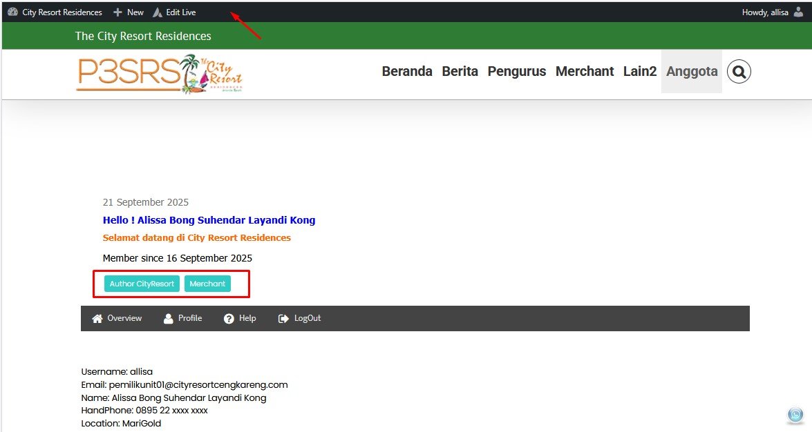 Pada gambar di atas terlihat bahwa username = allisa diberikan akses untuk melihat artikel “Author CityResort” dan “Merchant” dan diberikan akses untuk membuka “Dashboard” (untuk membuat artikel, dalam hal ini adalah iklan sebagai merchant)