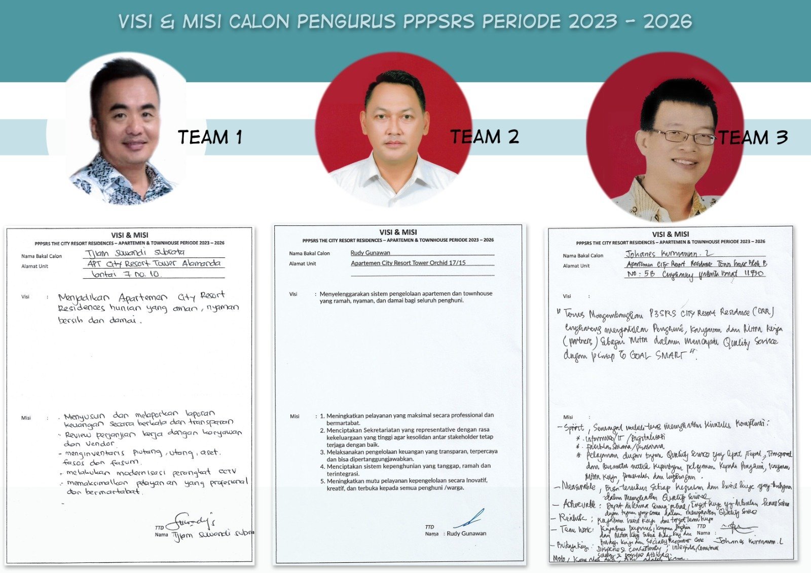 Pemilihan ini dilakukan melalui mekanisme pemilihan yang demokratis dan terbuka bagi seluruh penghuni. Setiap penghuni City Resort Residence berhak memilih dan dipilih sebagai pengurus atau pengawas. Para kandidat juga telah mempersiapkan diri untuk menyampaikan visi dan misi mereka dalam pengelolaan dan pengawasan lingkungan City Resort Residence.