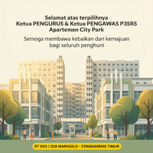 Pengurus RT 03 Marigold mengucapkan selamat dan sukses atas terpilihnya Ketua Pengurus P3SRS Periode 2026–2028, Bapak Starley Ruslim Sukmadjaja, serta Ketua Pengawas P3SRS, Bapak Kian An, di lingkungan Apartemen City Park.