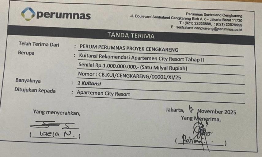 City Resort sudah melakukan pembayaran Rekomendasi SHGB Tahap ke-2 sebesar Rp 1.000.000.000